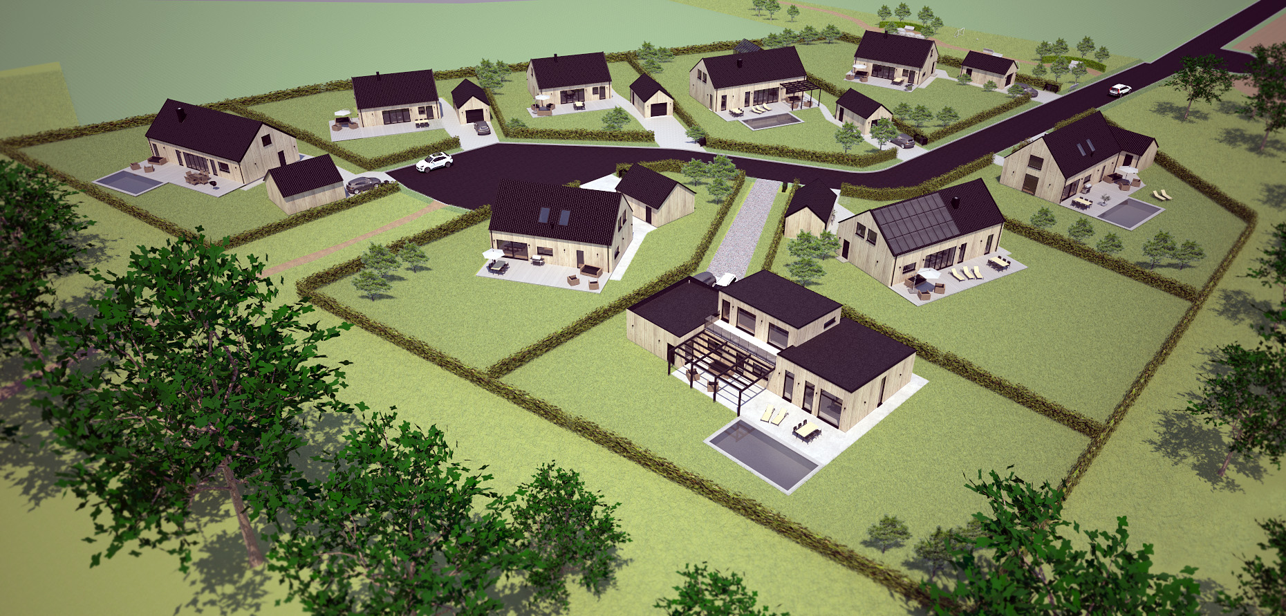 Husmodeller och storlekar är bara exempel på hur området kan se ut när det är färdigt. Man kan välja på en mängd hustyper, enplan, 1,5 plan och i vissa fall även två plan. Se detaljplanen för exakt information.